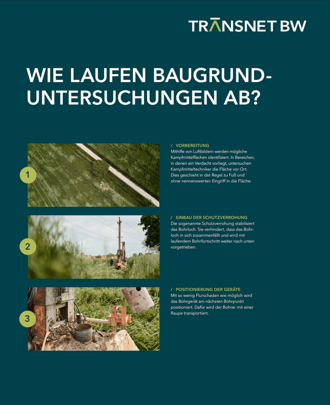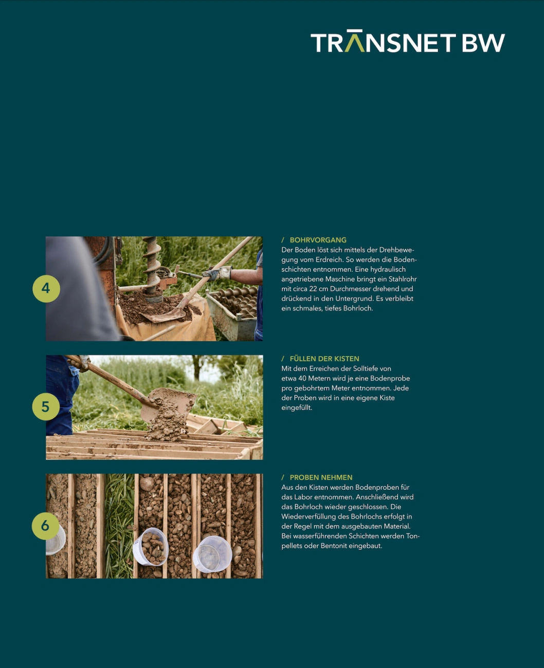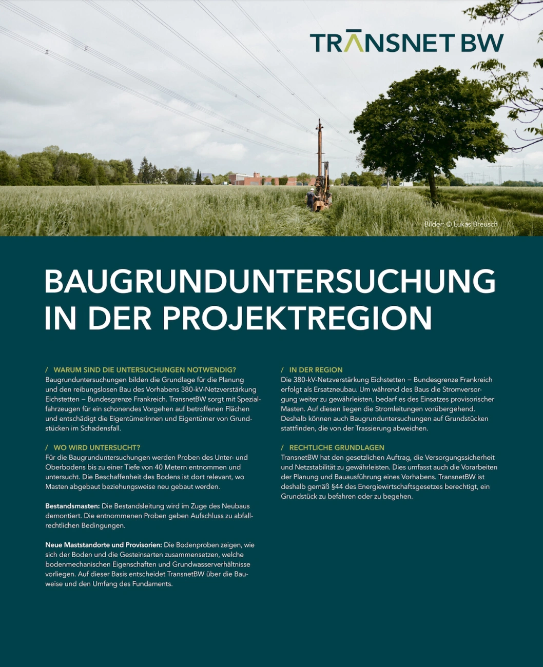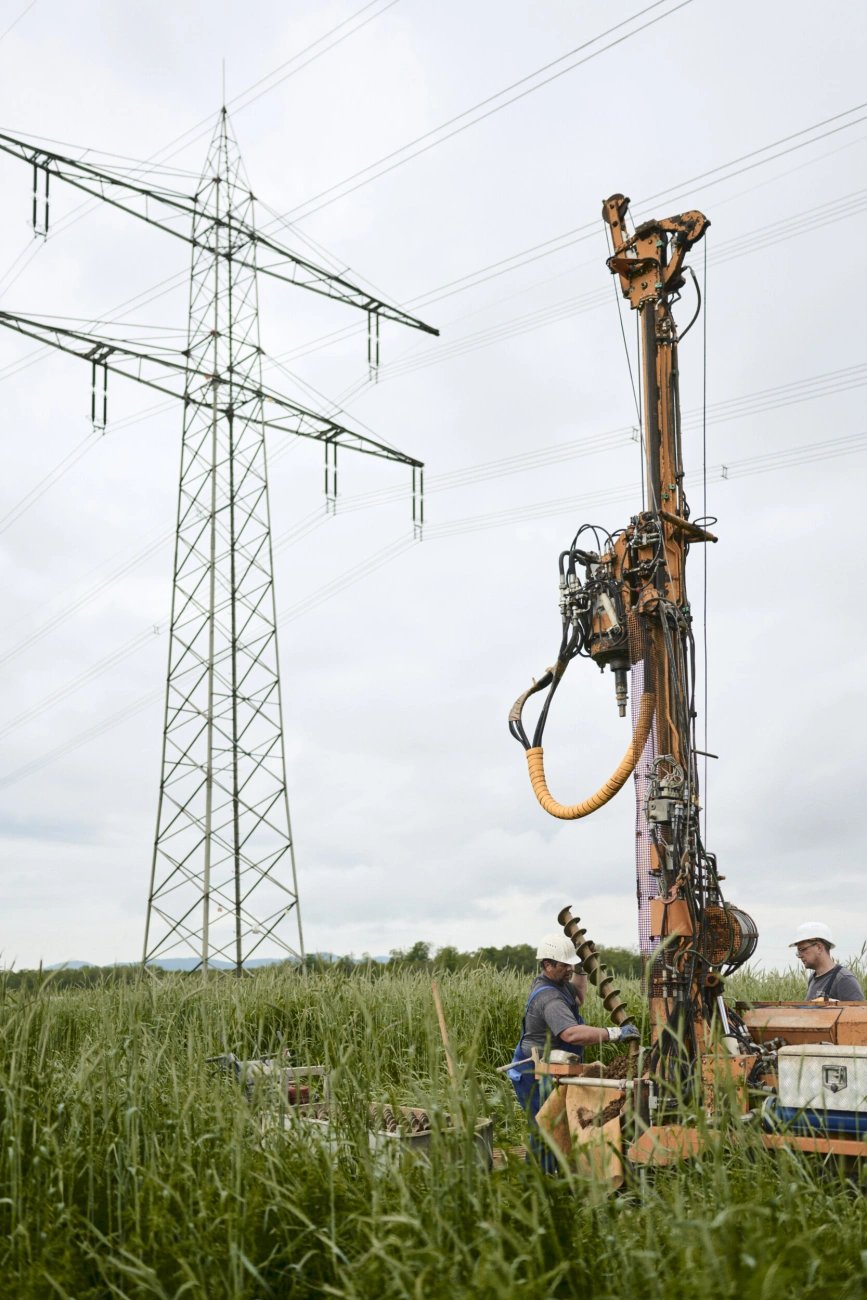 Meine Aufgabe war es, die Arbeiter bei der Erstellung einer Baugrundunterwuchung zu begleiten. Für neue Strommasten der Transnet BW muss zunächst der Boden statisch überprüft werden. Um diese Baumaßnahmen in einer Kommunikationskampagne der Bevölkerung darzustellen sollte es fotografisch festgehalten werden, um bei Infoveranstaltungen darüber zu informieren.